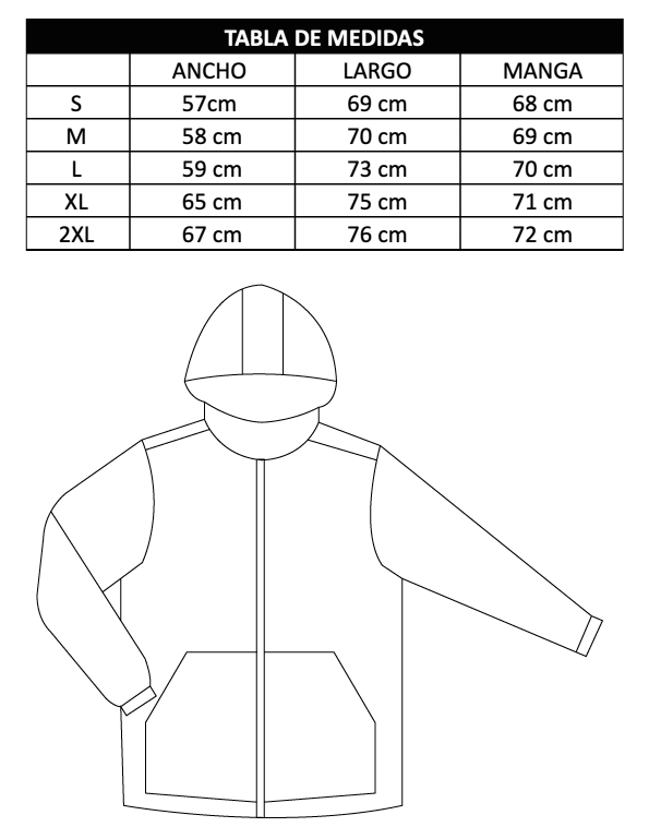 Campera de siré. En el frente tiene dos bolsillos. Con cierre diente de perro desmontable. La capucha ajusta con tancas plásticas. Los puños tienen elástico.
